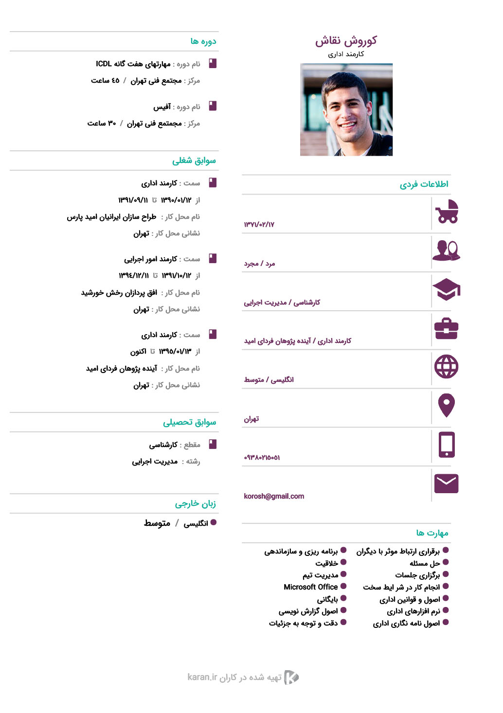 در بخش مهارت های کارمند اداری، می توانید همچنین به مهارت های نرم مثل توانایی کار تیمی ، مدیریت استرس، فن بیان و حتی مدیریت زمان هم اشاره کنید. اگر دنبال یک پلت فرم رزومه ساز می گردید رزومه ساز آنلاین کاران به شما کمک می کند یک رزومه کاری خوب و حرفه ای برای کارمند اداری بسازید.. کافی است یک ثبت نام فوری کنید
