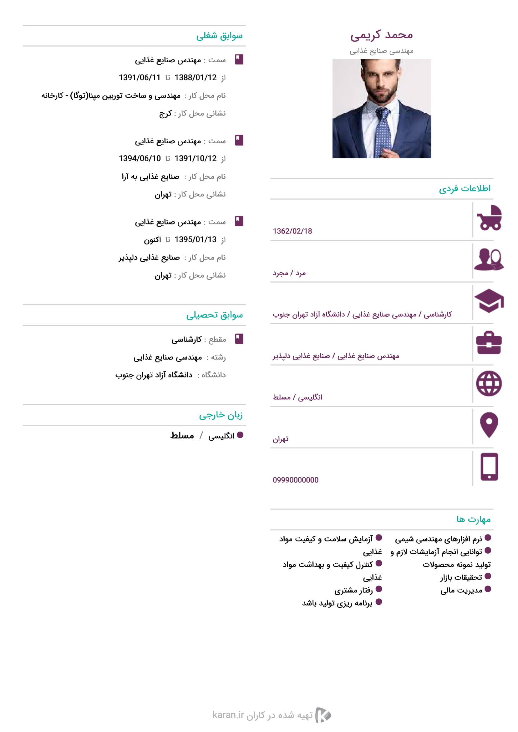 اگر دنبال یک رزومه ساز آنلاین می گردید رزومه ساز کاران به شما کمک می کند یک رزومه مهندس صنایع غذایی حرفه ای برای خودتان بسازید.کافی است یک ثبت نام فوری انجام دهید.