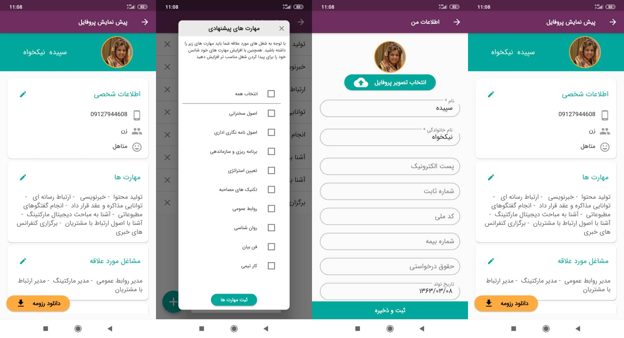 وقتی رزومه تان را تکمیل کردید، از گزینه "مشاهده پروفایل" می توانید فایل رزومه تان را به صورت کامل ببینید و در قالب یک فایل pdf با سه طرح متفاوت، دانلود کنید.