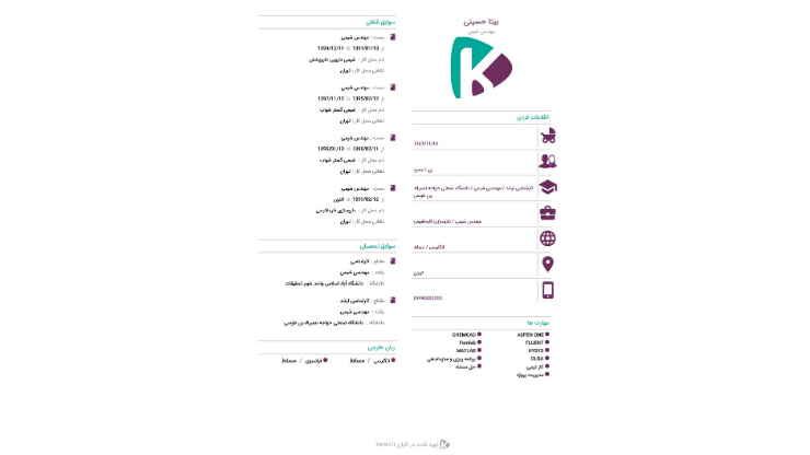اگر دنبال یک رزومه ساز آنلاین می گردید رزومه ساز کاران به شما کمک می کند یک رزومه مهندس شیمی حرفه ای برای خودتان بسازید.کافی است یک ثبت نام فوری انجام دهید.