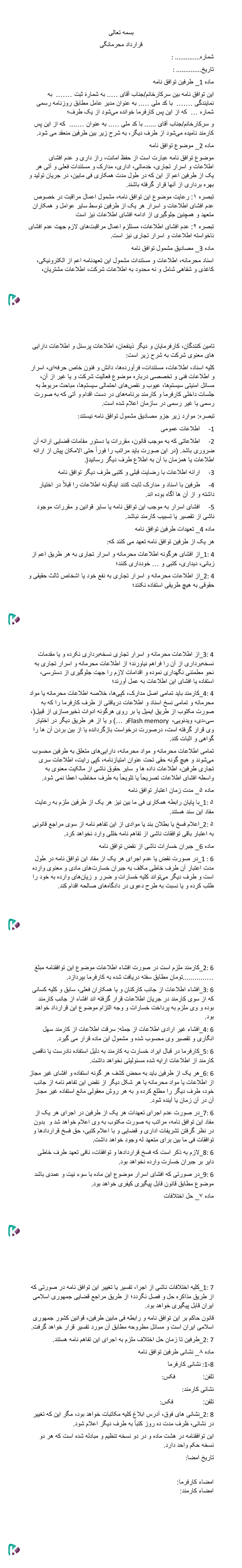 در تصویر زیر می توانید نمونه قرارداد محرمانگی و عدم افشا اطلاعات را ببینید.برای دیدن فایل با کیفیت نمونه قرارداد محرمانگی و عدم افشا اطلاعات اینجا کلیک کنید.