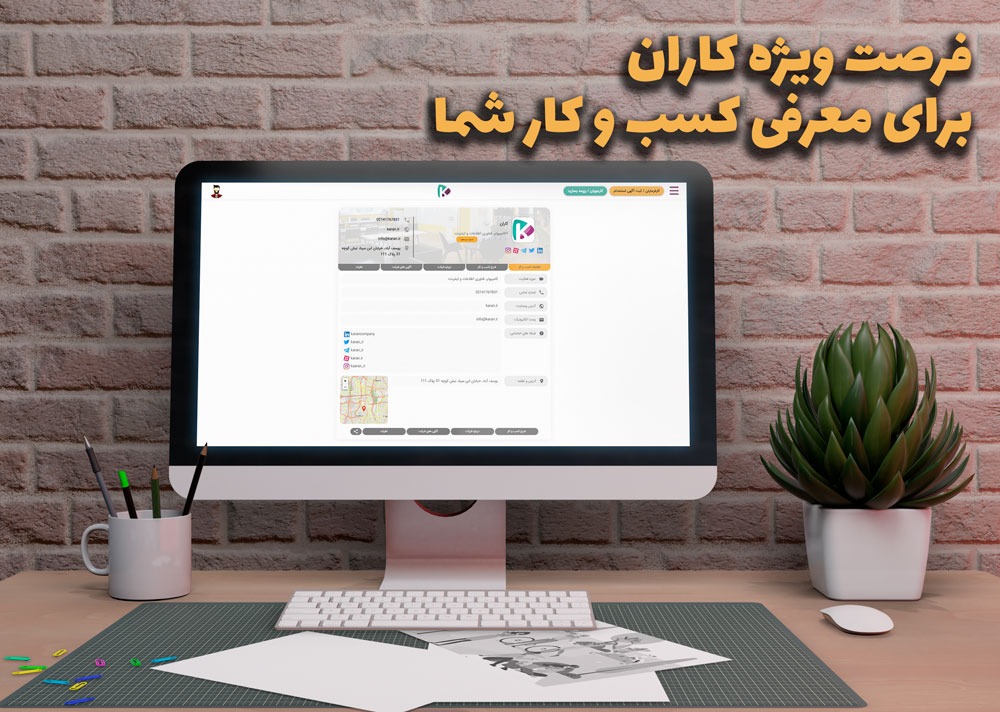 این صفحه، فرصت ویژه ای برای شما مدیر گرامی است تا بتوانید شرح فعالیت، مشخصات کاری شرکت و راه های ارتباطی تان را تبلیغ کنید. علاوه بر افزایش اعتبار و برندسازی، به کمک صفحه معرفی کسب و کار تان در سایت کاران، ارتباط مخاطبان و مشتریان با شما بیشتر خواهد شد.