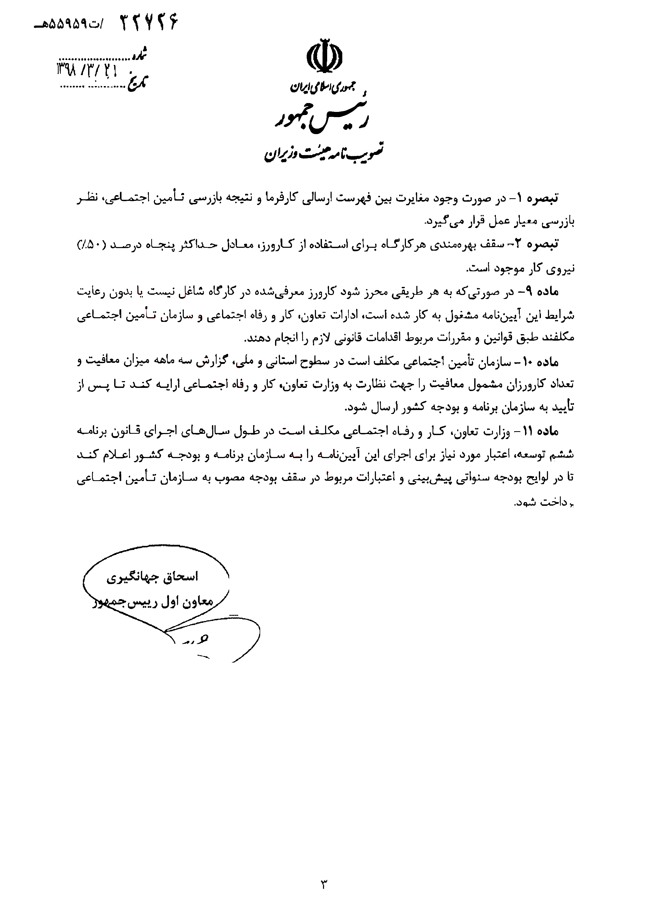 بر همین اساس دولت در اواخر اردیبهشت ماه، آئین نامه اجرایی طرح کارورزی فارغ التحصیلان را در هیأت وزیران تصویب کرد که این آئین نامه از سوی معاون اول رئیس جمهور جهت اجرا به وزارت تعاون، کار و رفاه اجتماعی، سازمان برنامه و بودجه و سازمان امور اداری و استخدامی ابلاغ شد.