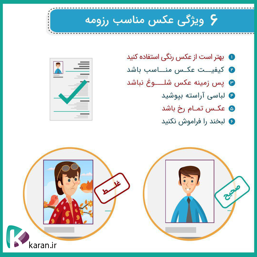 - کیفیــت عکـس رزومه کاری مهم است: تا جای ممکن از عکس های با رزولوشنdpi ۳۰۰ استفاده کنید.